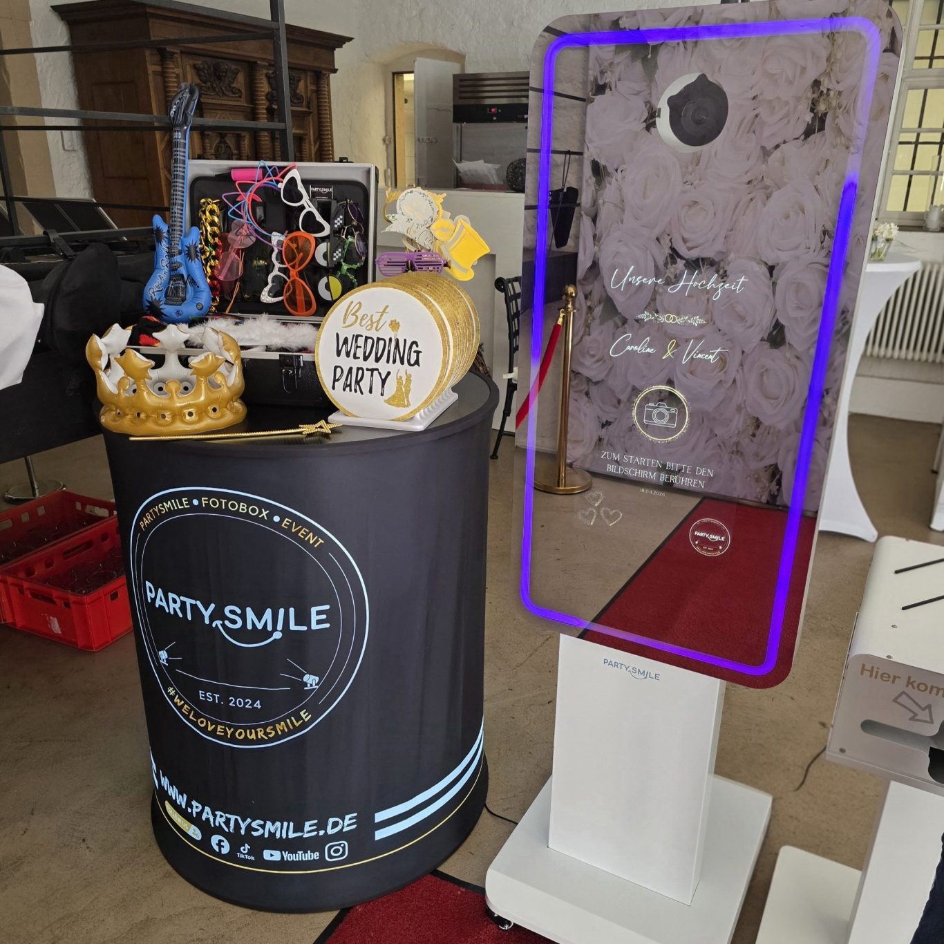Ein Absolutes Hoghlight auf der Hochzeit alle Gäste haben den Spiegel richtig gut angenommen, ebenso die mitgelieferten Requisiten waren sehr umfangreich und für jeden etwas dabei.