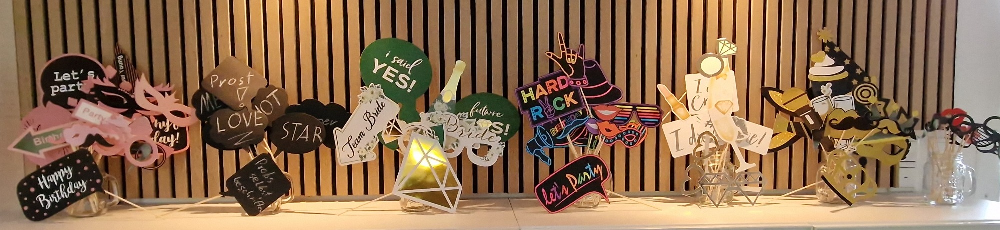 Unsere Requisitenkoffer werden immer nach Thema ausgestattet / angepasst. So erhalten Sie z.B. zur Hochzeit neben der Grundausstattung wie Brillen, Hüte und Kleinzubehör auch wirklich Themenbezogene Requisiten wie Herzbrillen, Fächer und passende Papierprobs.