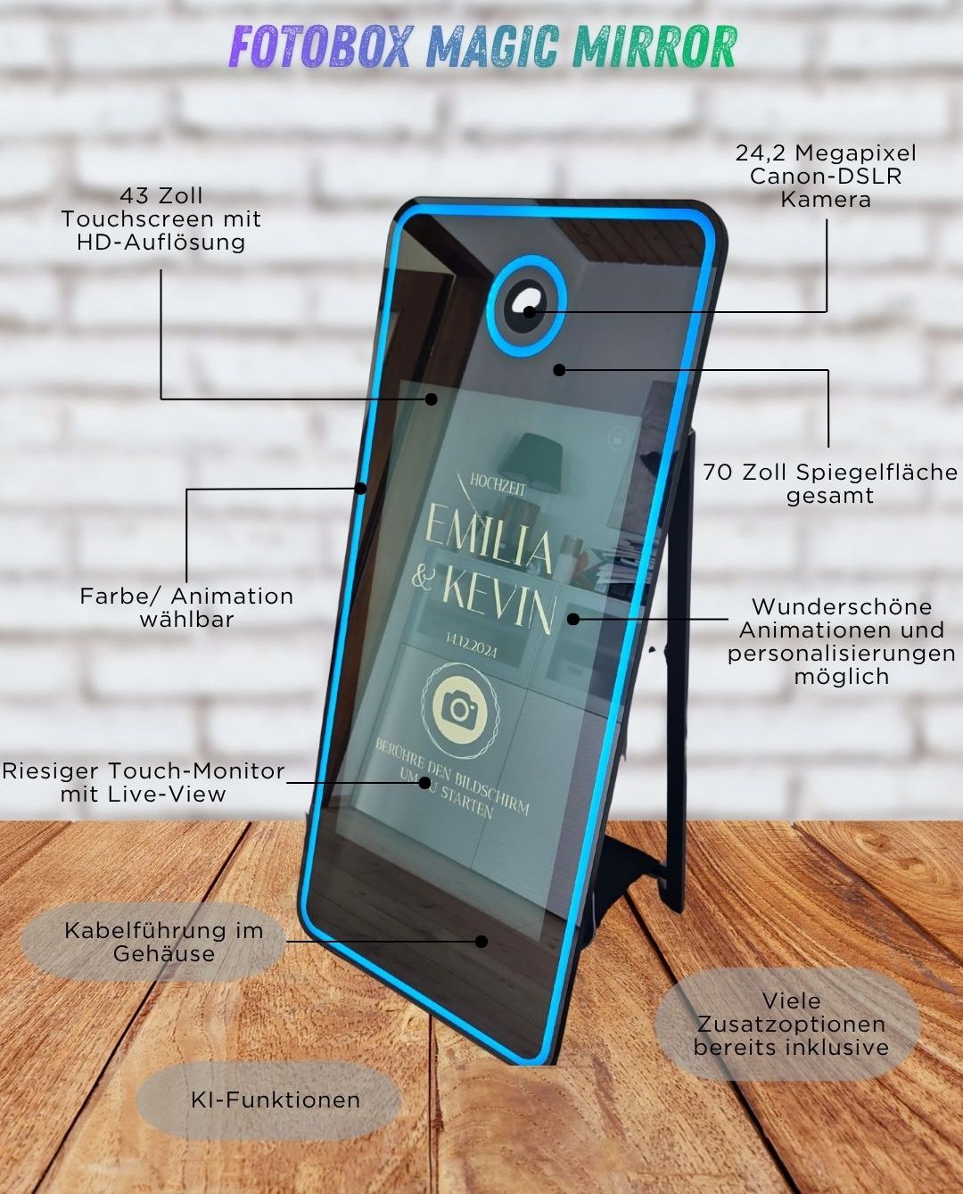 Unser Magischer Spiegel verzaubert Ihre Gäste mit hochwertigen Bildern und tollen Animationen.