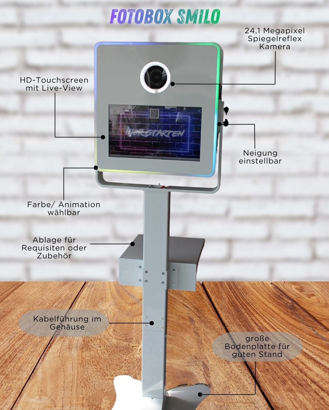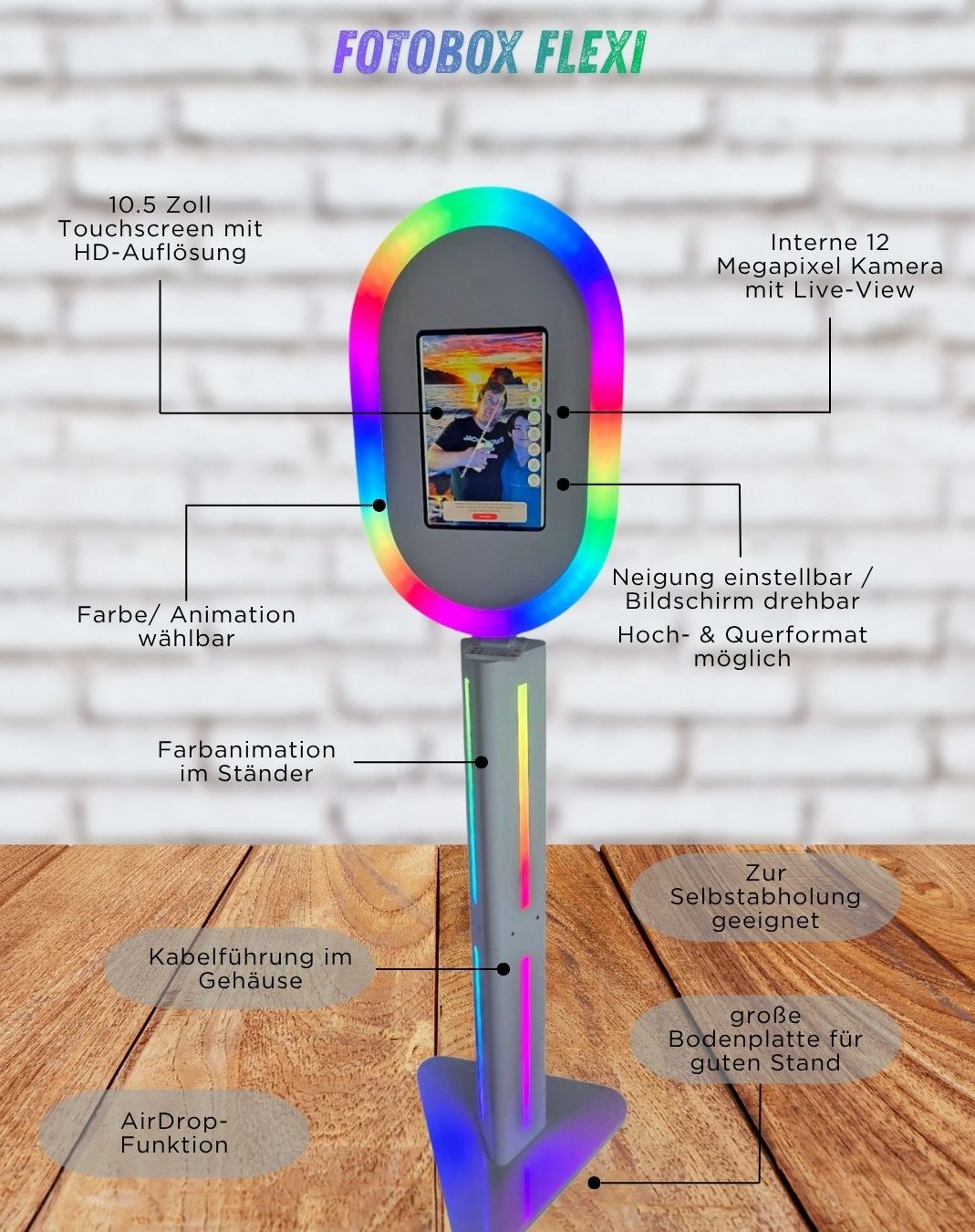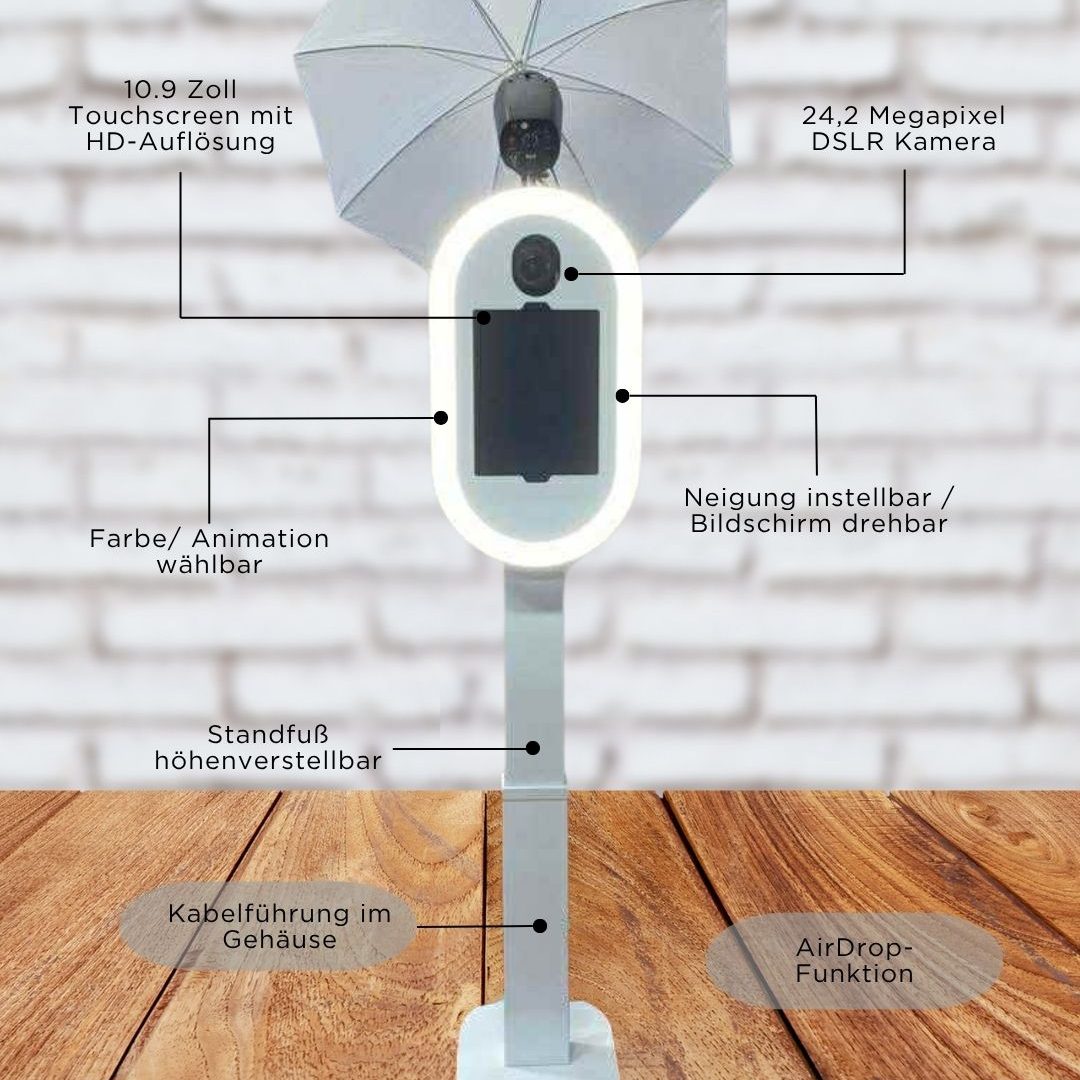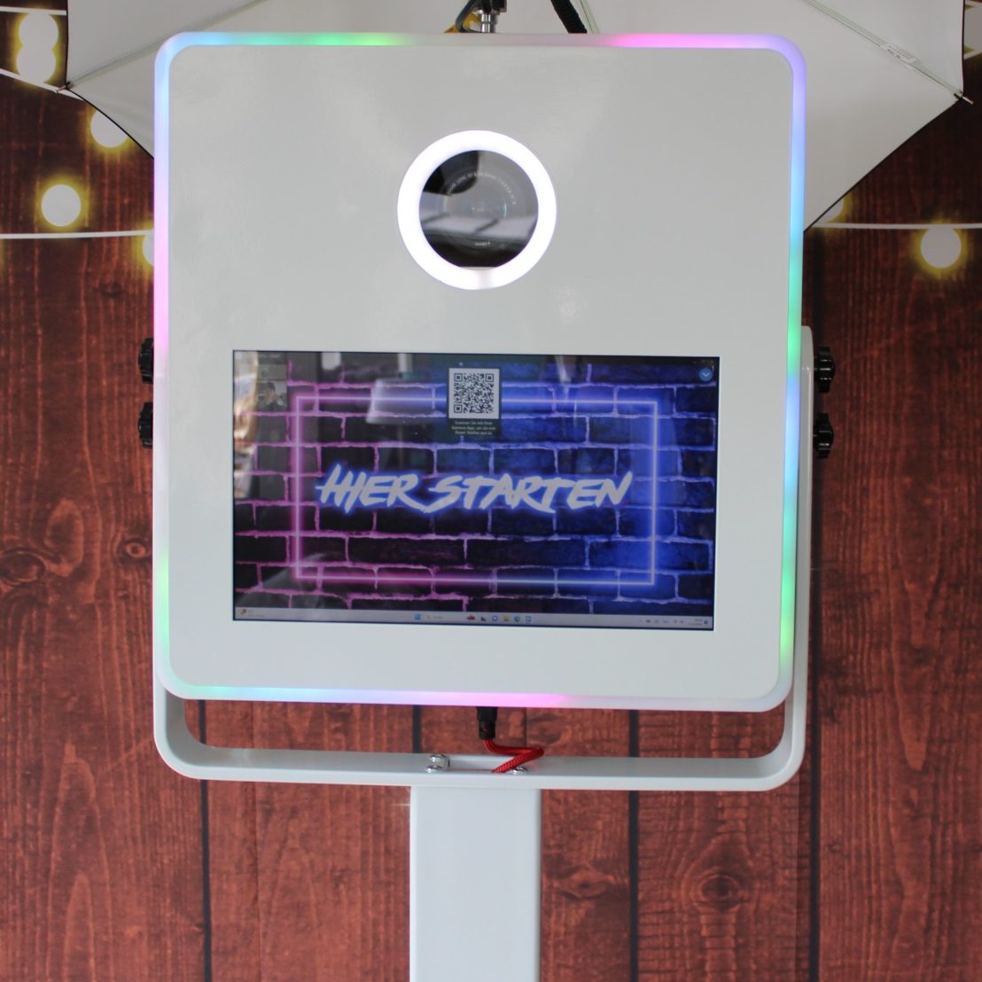 - Touchscreen & Live View in allen Boxen. Greenscreen & KI-Background ist bei fast allen Fotoboxen möglich.