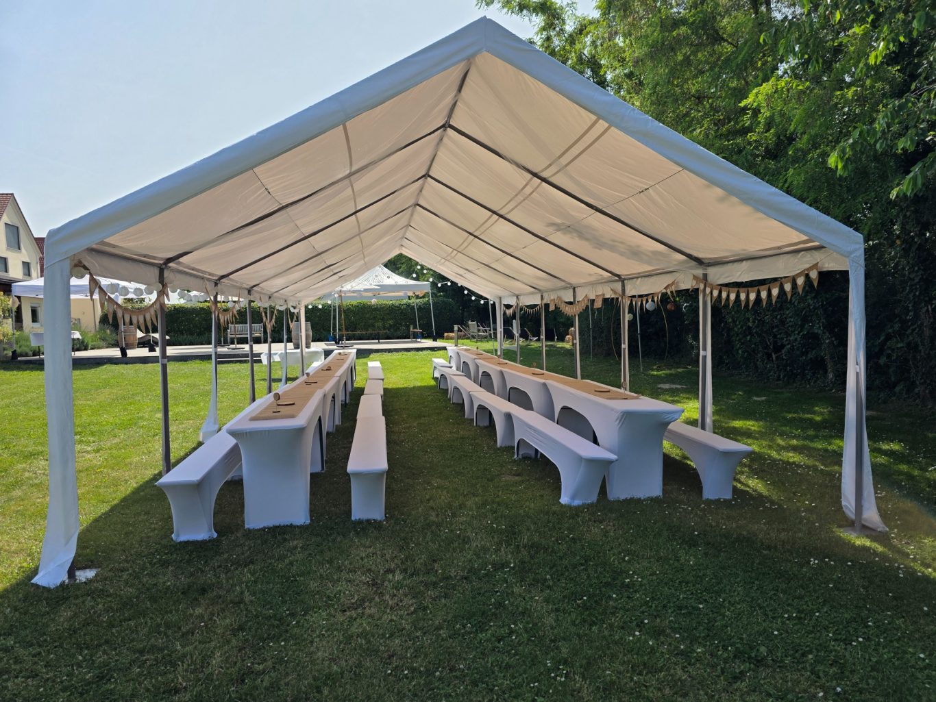 Zelte für größere Feiern. Immer ausgestattet mit robustem Gestänge und stabiler PVC-Plane mit UV80+ Schutz.